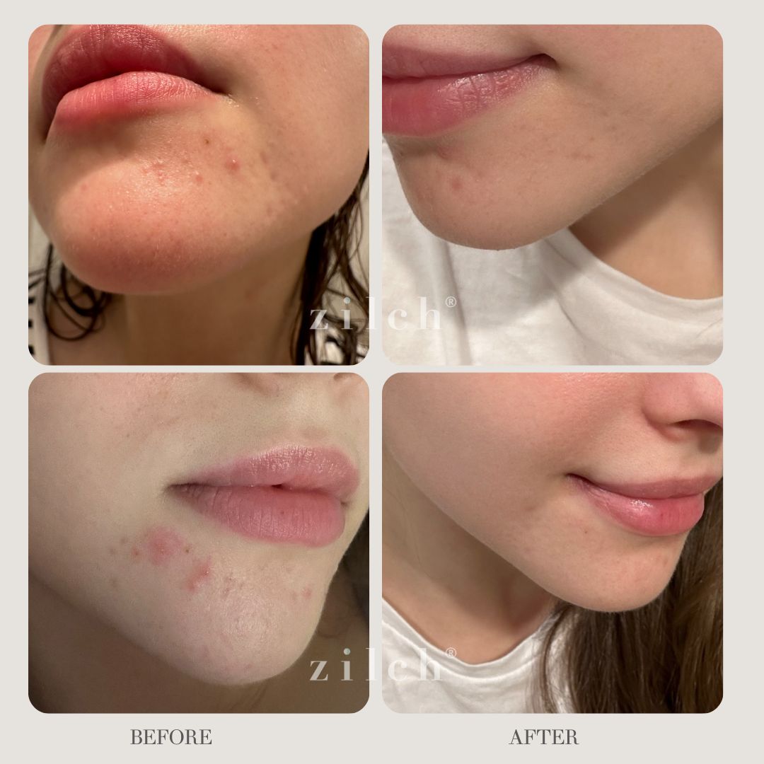 "I had acne on my cheeks and all around my mouth and jawline. Nothing I had tried for the past 3 years had worked. I found Zilch on inst...agram and did a lot of research and saw their amazing results and decided to try them for myself. Not even a week later and my skin was already clearing up. Fast forward a few weeks and my skin was less red, less inflamed and I had no new acne appearing. Just over a month and my acne had completely cleared! With no side effects and after 4 years of painful acne these were the only things that worked for me! They are a little expensive but they work and not only did they clear my skin but they helped my body too."