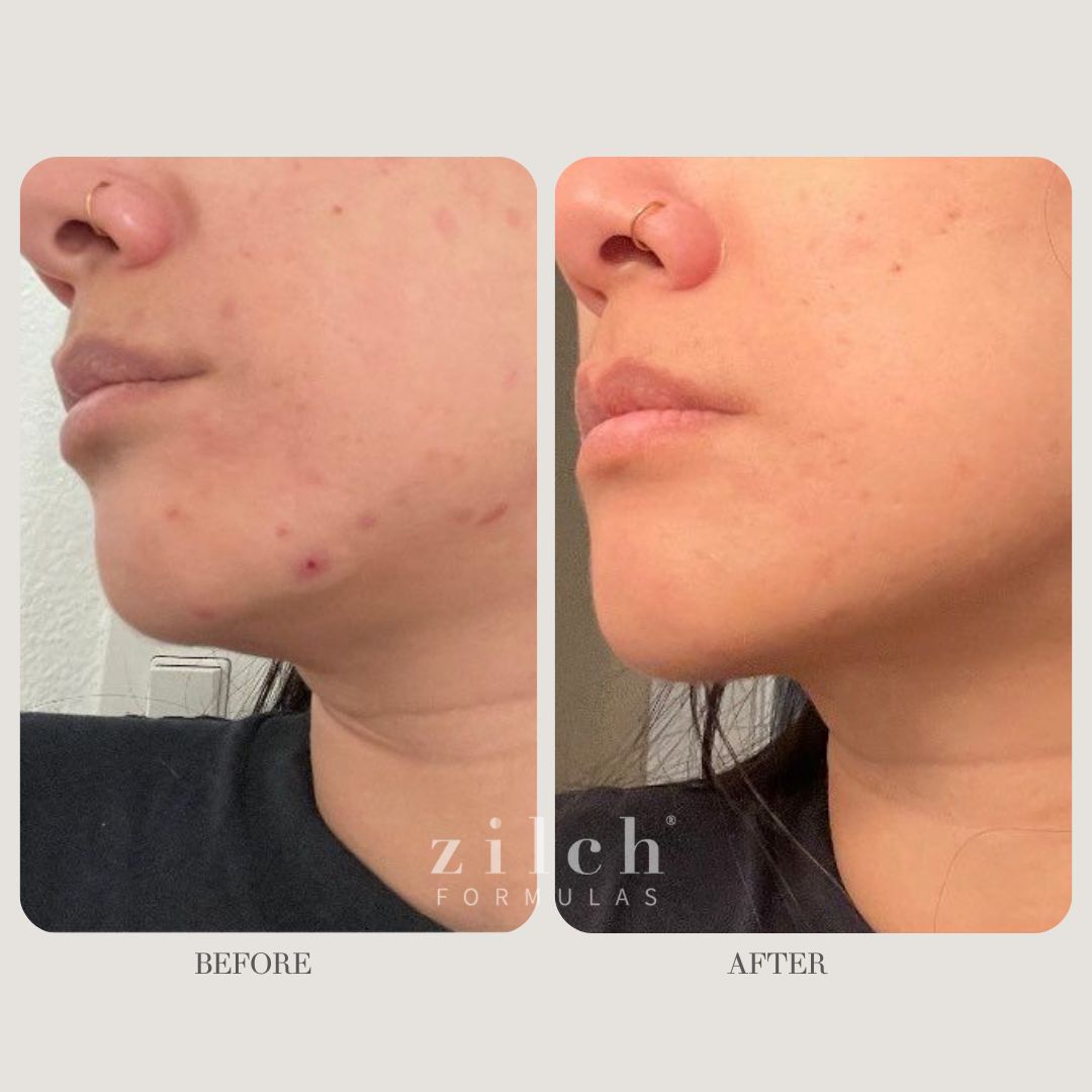 "I had acne on my cheeks and all around my mouth and jawline. Nothing I had tried for the past 3 years had worked. I found Zilch on inst...agram and did a lot of research and saw their amazing results and decided to try them for myself. Not even a week later and my skin was already clearing up. Fast forward a few weeks and my skin was less red, less inflamed and I had no new acne appearing. Just over a month and my acne had completely cleared! With no side effects and after 4 years of painful acne these were the only things that worked for me! They are a little expensive but they work and not only did they clear my skin but they helped my body too."